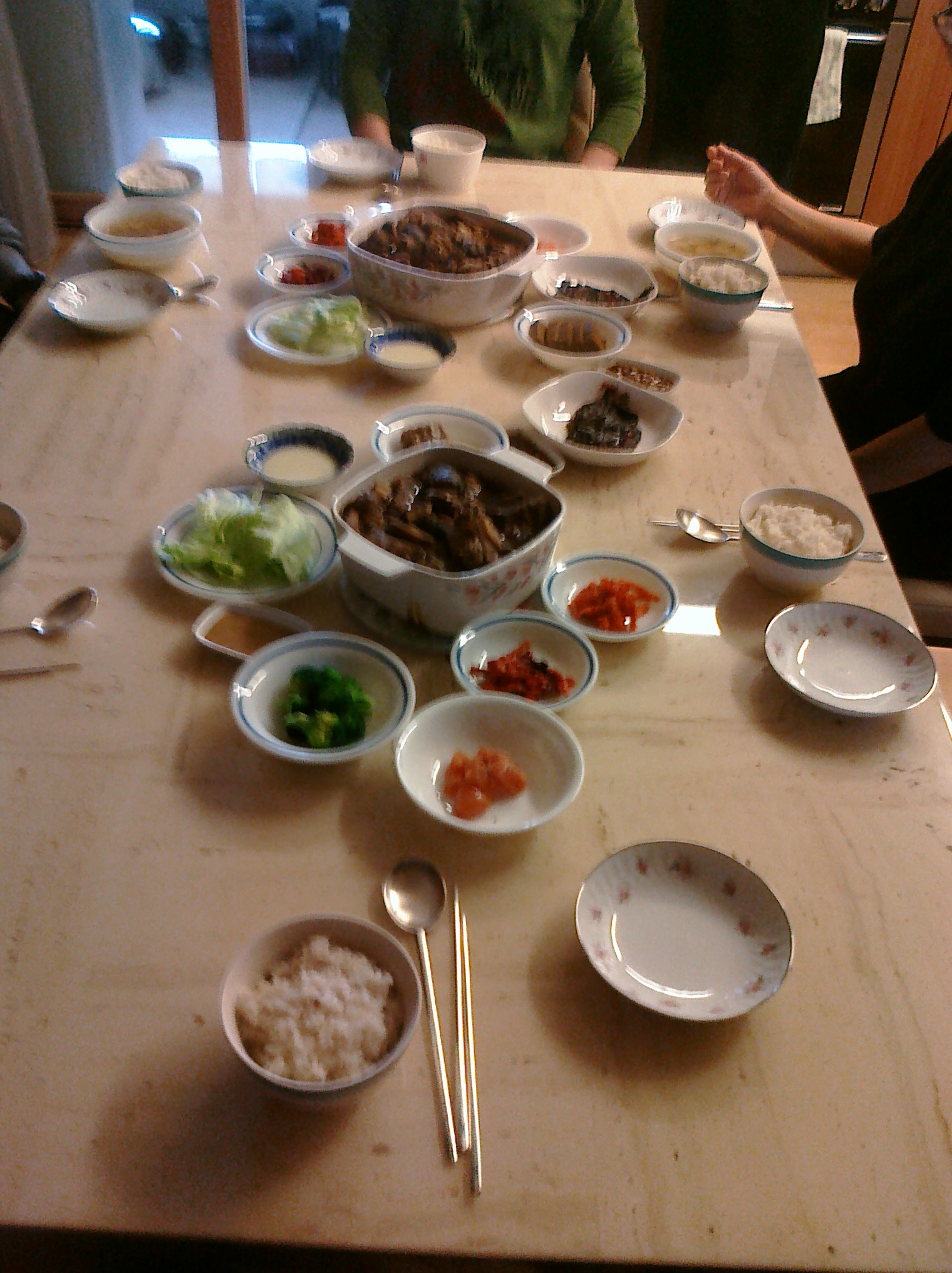 This, my friends, is not a typical Korean breakfast by any means. This is something a master of the Korean kitchen spends a whole day preparing and executing flawlessly. I mean, for reals. If my mother wasn’t still alive, I would say that it was the finest example of Korean home cooking I’ve ever had. That might be the vacation talking, but those two big dishes of meat in the center were superlative examples of the Korean-style braised short rib dish called Kal Bi Jihm. The smaller dishes you see – the dishes/garnishes known as banchan – were also wonderful. Spicy salads and marinated vegetables and a whole lot of subtlety in flavor generally found lacking in the cuisine – my aunt is a PIMP. We’ll be tackling Kal Bi Jihm and banchan in another post.